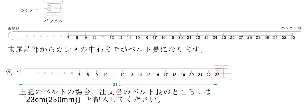 ベルトの長さは末尾側端部からバックル受けのカシメがつく穴の中心までがベルト長になります。