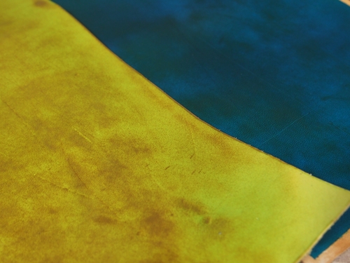 淡い色や青・緑系のものに蝋引き加工をすると革によっては革の地色(飴色)が強く浮かび上がってかなり独特の色合いの色むらがでることがあります。